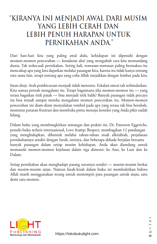 Setiap pernikahan akan menghadapi pasang surutnya sendiri — musim-musim berkat dan musim-musim ujian. Namun kisah-kisah dalam buku ini membuktikan bahwa Allah masih menggunakan terang untuk memimpin para pasangan untuk maju, satu demi satu momen.