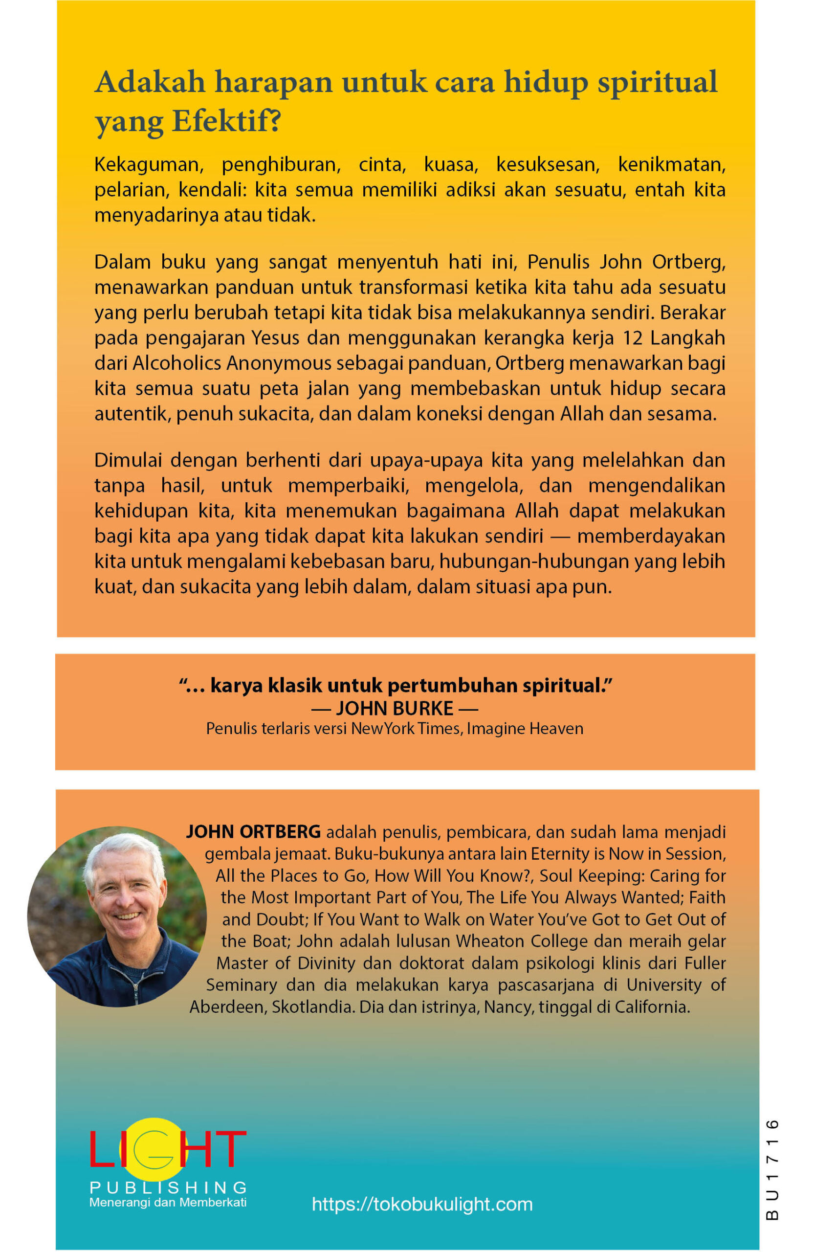 Dalam buku yang sangat menyentuh hati ini, Penulis John Ortberg, menawarkan panduan untuk transformasi ketika kita tahu ada sesuatu yang perlu berubah tetapi kita tidak bisa melakukannya sendiri. Berakar pada pengajaran Yesus dan menggunakan kerangka kerja 12 Langkah dari Alcoholics Anonymous sebagai panduan, Ortberg menawarkan bagi kita semua suatu peta jalan yang membebaskan untuk hidup secara autentik, penuh sukacita, dan dalam koneksi dengan Allah dan sesama.